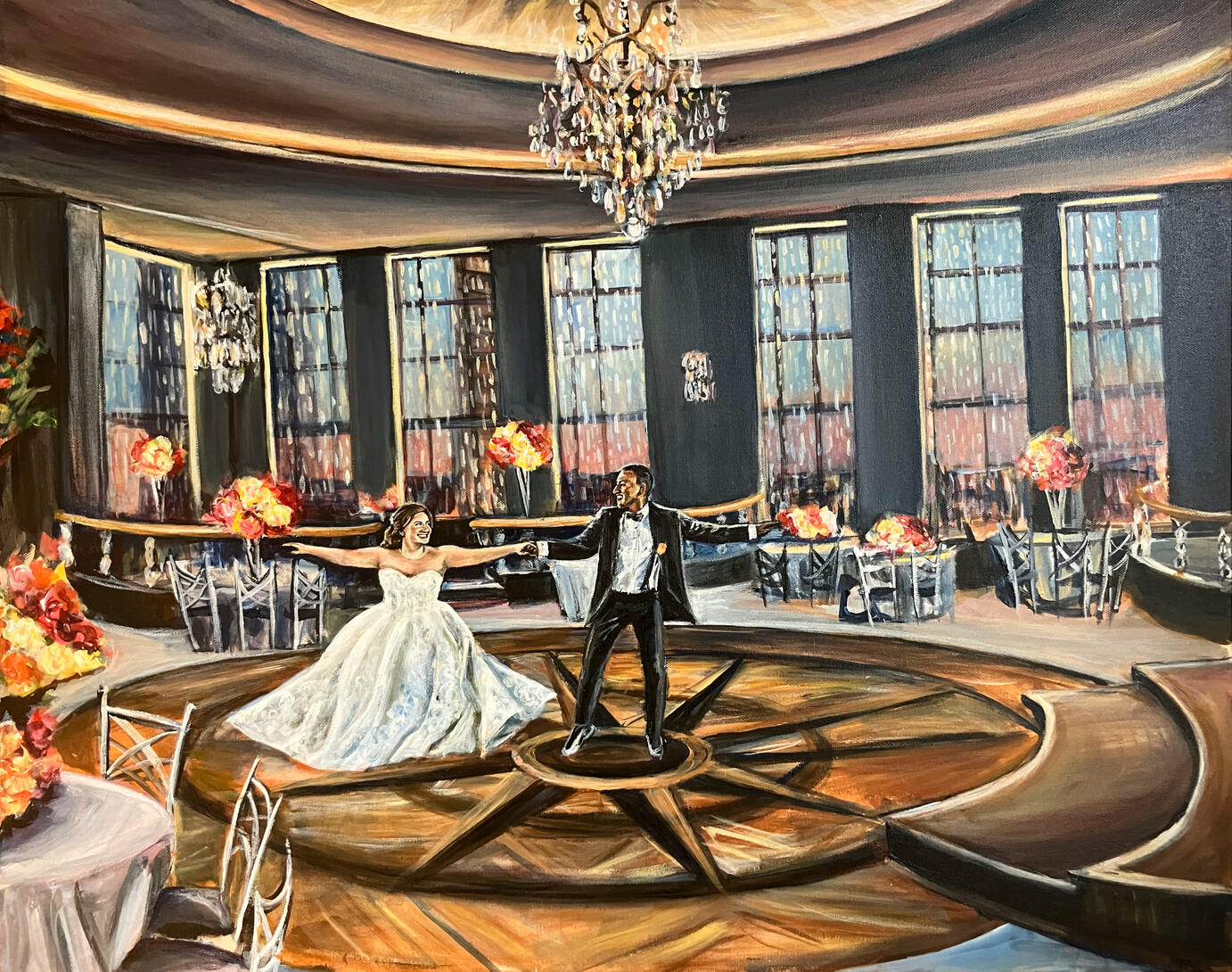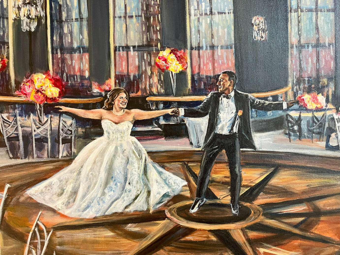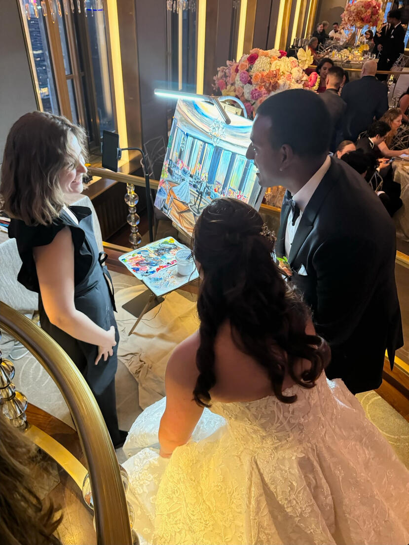 I will come to your venue a couple hours before the ceremony to set up and start working on the background. I will take reference photos of the couple for the moment of your choosing (first kiss, ceremony exit, first dance, etc) and work on the painting during the reception so the guests can enjoy watching the process.Wedding paintings are artist-grade archival acrylic paint on high-quality stretched canvas. At the end of the night I bring your painting home with me for touch ups and a protective varnish. If you live in NYC we can arrange a pickup or local delivery, if not I can ship it to you (shipping costs apply).