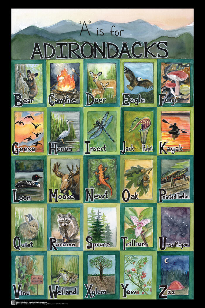This Adirondack Alphabet poster is a print of a work composed of 26 hand crafted watercolor images. I created the original piece as a gift for my nephew's first birthday, honoring our family’s beloved tradition of vacationing in the Adirondacks. Since completing it, I've heard from many Adirondack lovers in my circle of friends and family - parents with young children, educators, camp-owners, and vacationers have all expressed interest in buying a print. I'm happy to say that it's now available!These are high-quality posters, professionally printed on 100# Chorus Art Silk finish cover stock paper. If you're interested in purchasing a print or buying a wholesale run for your business, use the Contact Page and we'll get right back to you!